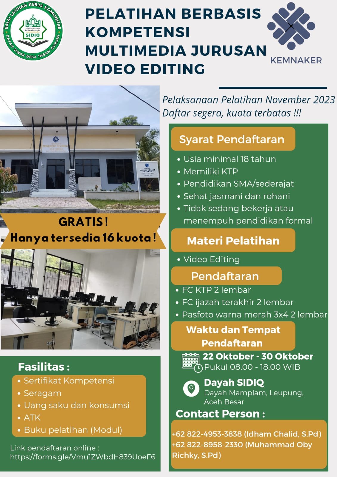 (BLKK DAYAH SIDIQ dibawah Yayasan Sinar Desa Insan Qurani) bekerjasama dengan Kementerian Ketenagakerjaan (Kemnaker) Akan melakukan pelatihan berbasis kompetisi multimedia jurusan video editing. Kegiatan ini menjadi perdana dilaksanakan dan akan berlangsung di Balai Latihan Kerja Dayah SIDIQ, Leupung, Aceh Besar.